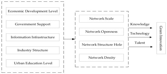 Regional knowledge production and technology transformation achieve development through innovation networks. Typically, innovation motivation stems from the connection between innovation subjects. Economic development provides a conducive environment for the flow of regional knowledge, technology, and other elements; government funding significantly contributes to the smooth running of innovative activities; improving the information infrastructure is a prerequisite for the flow of innovative talents among regions; the tertiary industry enables innovation subjects to have a competitive advantage, expanding the scale of innovation; urban education to promote regional innovation activities to carry out the study provides a platform for exchange. Hence, based on network structure characteristics, this paper arranges the influencing mechanisms of green innovation in the Great Changzhou-Zhuzhou-Xiangtan area, as shown in Figure 1.