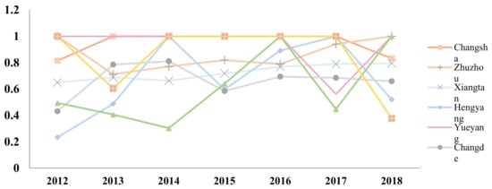 The green innovation efficiency of the Great Changsha-Zhuzhou-Xiangtan City Group was generally stable. In terms of the overall time series, the mean green innovation efficiency values of the Great Changsha-Zhuzhou-Xiangtan City Group from 2012 to 2018 were 0.7030, 0.7108, 0.8184, 0.7951, 0.8929, 0.8031, and 0.7729, respectively. The overall mean values of green innovation efficiency fluctuated at a medium level and showed a stable trend. This may be because Hunan province has focused on constructing a two-oriented society in the core area of urban agglomeration, improving the overall green development of the Great Changsha-Zhuzhou-Xiangtan City Group to a certain extent in recent years. At the same time, influenced by the international environment, China’s economy has slowed down; with tremendous downward pressure, the transformation of technological innovation achievements into practical productivity in the Great Changsha-Zhuzhou-Xiangtan City Group is insufficient. In the meantime, rational allocation and utilization of innovative resources are hindered, so the overall efficiency is low. The distribution trend of green efficiency in urban agglomeration is shown in Figure 2. Therefore, the green innovation development of urban agglomeration cannot be achieved without a favorable innovation environment.