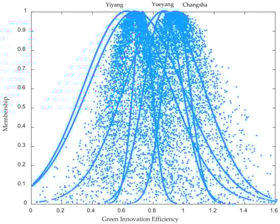 Normal cloud-membership degree distribution of green innovation efficiency in the Great Changsha-Zhuzhou-Xiangtan City Group.