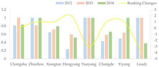 The “mid-stream drive” difference of green innovation efficiency in the Great Changsha-Zhuzhou-Xiangtan City Group is noticeable. Figure 3 shows the apparent differences between cities such as Changsha and Yiyang and other cities in the urban agglomeration; however, other cities need further analysis based on Figure 4 and Figure 5. We can see from Figure 4 that Xiangtan, Changde, and Hengyang are classified into one category, and the green innovation efficiency value is between 0.6 and 0.7. Combined with Figure 5, Xiangtan moves up by one place, Changde moves up by one place, and Hengyang moves up by two. The reasons are as follows. First, Xiangtan encourages independent innovation and strengthens R&D and project promotion by the government bonus policy. For example, the Implementation Measures for Encouraging Scientific and Technological Innovation in Xiangtan High-tech Zone, issued in 2016, enhanced the guiding role of government expenditure on green innovation and promoted the innovation efficiency of the region to maintain an excellent level. The Changde Office of Science and Technology issued some awards in Changde Science and Technology Awards in 2017 to stimulate the initiative of innovation subjects, accelerate the transformation of innovation achievements, and improve the innovation system. Hengyang proposed Measures for The Administration of Subsidies for Science and Technology Services (trial) for innovative services subsidies, enhancing the innovation capacity of relevant enterprises. Second, Zhuzhou and Loudi are the second types, with a green innovation efficiency ranging from 0.85 to 0.90. Zhuzhou moves up by one place, while Loudi moves down by four places. The reason may be that the limited economic scale is the main factor in developing green innovation. The small scale of a regional innovation network and insufficient innovation investment seriously hinder the improvement of innovation efficiency.