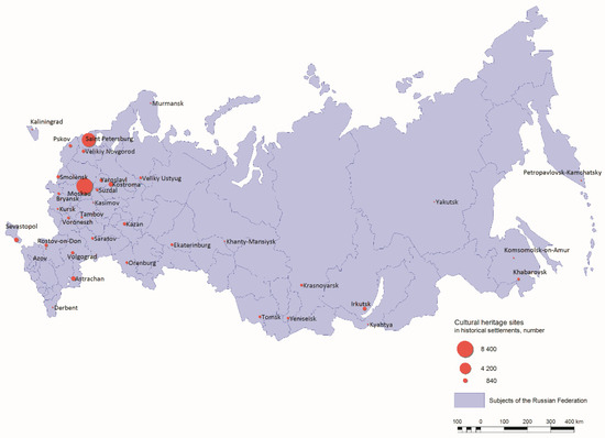 The global issues of preserving and adapting cultural heritage sites have also been brought up in Russia. Russia has tremendously rich historical and cultural heritage. According to the Unified Interdepartmental Statistical Information System (UISIS) [1], as of 1 January 2021, there are 269,195 immovable monuments of history and culture in Russia, of which 43.8% of the monuments belong to identified Cultural Heritage Sites (CHS) (Figure 1). The cultural heritage of the Russian Federation is concentrated in 519 historical settlements, of which 41 are federal settlements.