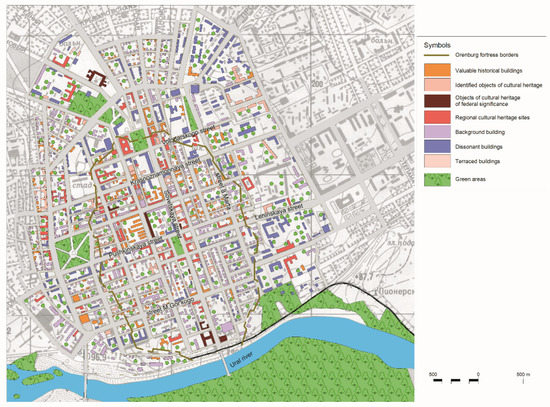 The study object is Orenburg, and the territory of historical settlement of regional significance is the regional center of the Orenburg region (Figure 3).