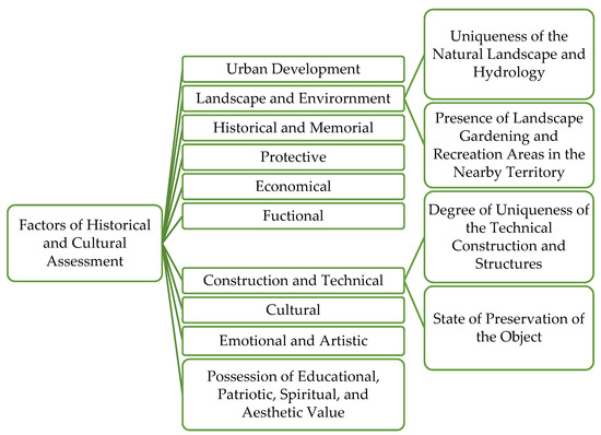 The first stage of research includes the formation of a list of factors of historical and cultural assessment of lands that characterize the features of the urban environment (Figure 6) [31].