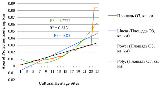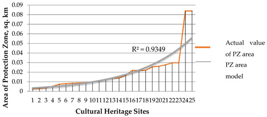 One of the tools for solving the problem of establishing optimal sizes of protection zones for cultural heritage sites and modernizing the process of designing their boundaries can be the use of mathematical and statistical methods as a stage of project boundaries for modeling the required area of protection zones for cultural heritage sites. This will allow the collection of objective data on the current condition of the territory and predicting, based on the existing situation, the dimensional values for other objects. Moreover, models of zones of protection for cultural heritage sites will help make the process of developing the designs of the boundaries of protection zones more efficient and reduce their cost [28].