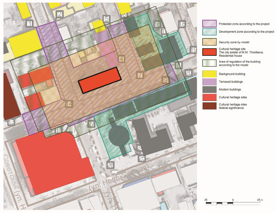 Immovable cultural heritage sites act as mode-forming objects that impose special restrictions on the use of urban areas [22]. These restrictions are considered in the process of land use regulation, which is associated both with creating conditions for sustainable development of territories, ensuring the comfort of living of the population and increasing its wellbeing, as well as preserving the environment, reducing the negative impact on the environment and humans, and preserving cultural heritage sites. Effective and rational use of territories makes it possible to maintain land and resource potential and to ensure sustainable development, which the modern world is seeking to achieve [18,23,24].