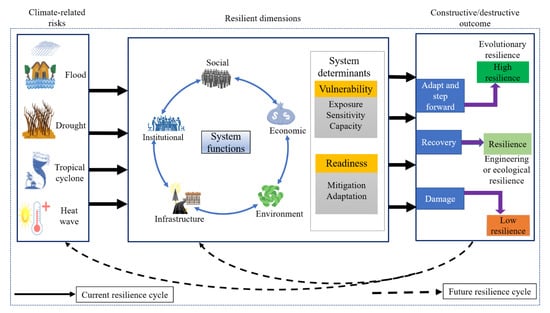 The concept of resilience is now the de facto framework for countries and regions climate-related disaster readiness, response, and recovery [13]. The advancement of the concept “climate change resilience” in recent years has become significant for organizations, communities, governments (local and central) to enhance their ability to prepare and plan for, absorb, recover from and adapt to potential adverse effects of climate change in a timely and efficient manner [14]. The conceptual models and literature on resilience are robust, ranging from those that consider the concept as a system such as food security [15], infrastructure [16] and governance [17], to those that consider resilience as a core construct and place-based concept [18] that has been applied to the human environment such as urban and rural areas [19] as well as thematic areas such as sustainability [20] and climate change [21]. Moreover, some consider resilience as a cross-scale [22] which entails a closer look at the scale at which the framework intends to measure, such as resilience at a local level [23], at the city level [19], and the national and system-level [24]. Hence, resilience scales are argued to be inherently intertwined as the resilience of an individual level is influenced by the resilience of the community extensively, which in turn influenced my national level; nevertheless, features of resilience manifest differently at each level [22]. Lastly, those who consider resilience as a time series highlight the critical importance of the temporal aspect of resilient measurement [25].