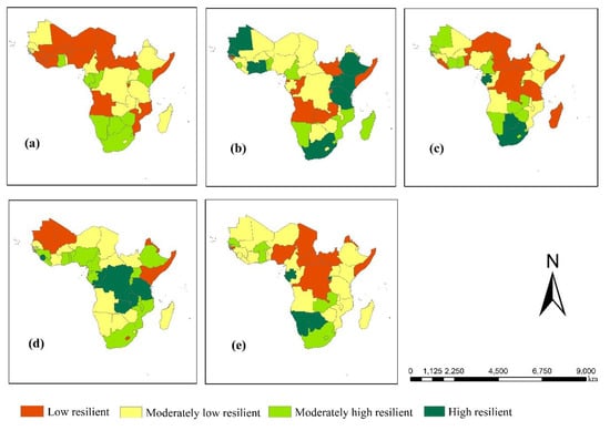 Resilience scores for five-dimension categories of SSA: (a) social, (b) economic, (c) infrastructure, (d) environment and (e) institution. Result classified into low, moderately low, moderately high, and high resilient.