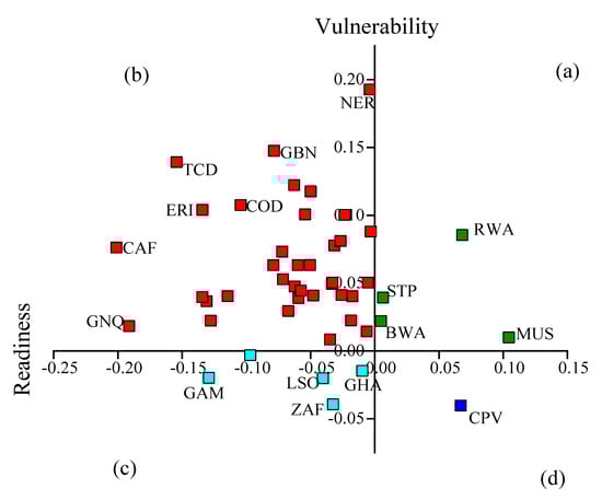 Comparisons of countries in SSA vulnerability and readiness to climate risks: (a) high vulnerability and high readiness, (b) high vulnerability and low readiness, (c) low vulnerability and low readiness, and (d) low vulnerability and high readiness.