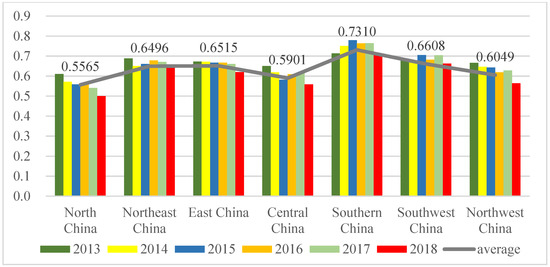 The average level of urban human settlements in the seven regions of China.