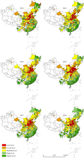 ArcGIS natural discontinuity method is used to classify data and form five types of human settlements in prefecture-level cities in China: low level, lower level, medium level, high level, and higher level (Figure 3).