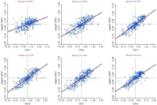 Scatter plot of Moran’s I index in China’s prefecture-level human settlements from 2013 to 2018.