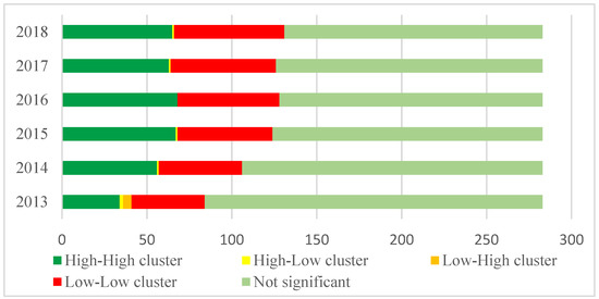 Statistics on the number of Local Moran’s I of cities from 2013 to 2018.