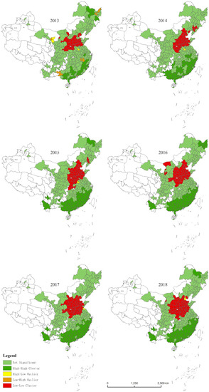 From 2013 to 2015, the Moran’s I value generally increased (Table 5), the spatial distribution of human settlements showed a stronger HH and LL agglomeration pattern, and it also showed a trend of increasing spatial agglomeration. The spatial differences of urban human settlements were also gradually obvious. From 2015 to 2018, the spatiality was reduced, and the level of human settlements in urban spatial units showed a certain convergence, which is becoming increasingly prominent. It can be seen that after 2015, the human settlements based on air quality in Chinese cities no longer exist in a single individual form. The correlation between cities is becoming closer and closer.