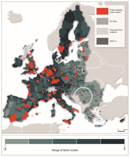 In this analysis, NUTS 3 were selected as the observation units for both the EU countries (with the exception of Germany, for which NUTS 2 were used) and Serbia. Despite criticism, for example, Hedlund [] pointed to need for typologies based on high-resolution data, beyond the urban–rural continuum, respectively the administrative boundary, this level was chosen for two reasons. First, it represented the lowest administrative and territorial level at which data could be found for all countries included in the analysis; second, regional typologies applied at this level aimed to analyse and monitor rural and urban development by implementing certain regional and rural policies and programs. NUTS 3 allowed a detailed representation of EU rural space []. It is worth noting that the degree of differentiation among European rural regions is in line with the transitional processes described in the literature [], which is especially significant for former socialist states, both in the EU and in those, such as Serbia, which are candidates for membership. Spatial (i.e., territorial) distribution of regional performance was considered: different components followed different territorial paths across Europe, suggesting the existence of a puzzled core–periphery pattern, where within-region differences also matter [].