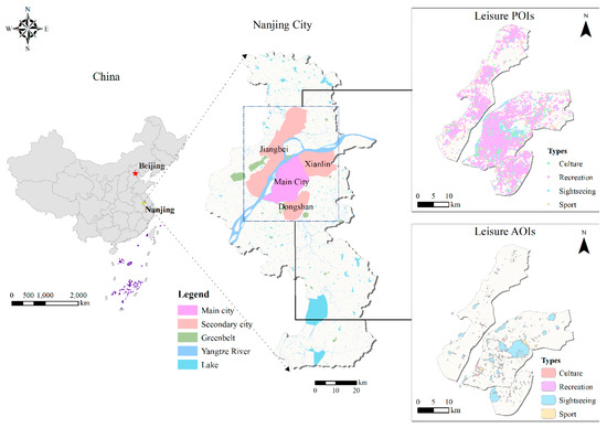 Nanjing, a member of the Yangtze River Delta city cluster, lies in the middle and lower reaches of Eastern China (118°22′–119°14′ E and 31°14′–32°37′ N). By the end of 2019, the permanent population of Nanjing was 8.5 million, and the urbanization rate reached 83.2% [48]. It has been classified as a beta-level city in the 2020 global city rankings compiled by the Globalization and World Cities Research Network, on par with Athens and Abu Dhabi [49]. It has a well-developed transportation network, convenient services, a large population, and a thriving economy, and Nanjing is also a world-famous historical and cultural city, which attracted more than 10 million domestic and foreign tourists in 2019. According to the Nanjing Master Plan (2010–2020), creating an international and vibrant city with distinctive cultural characteristics and a beautiful living environment has become the government’s goal. Therefore, it is of great practical value to characterize the leisure and tourism activities in this area. As a polycentric city, the main center area (main city) and three subcenter areas (secondary city) of Nanjing were selected as our study area, as shown in Figure 1.