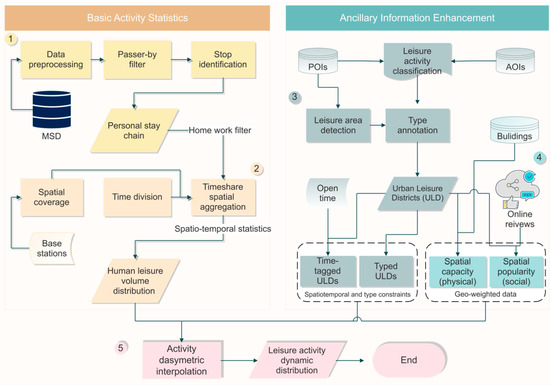 The quantitative estimation framework of urban leisure activity dynamic distribution merging multiple big data. The five core steps are drawn using different colors.