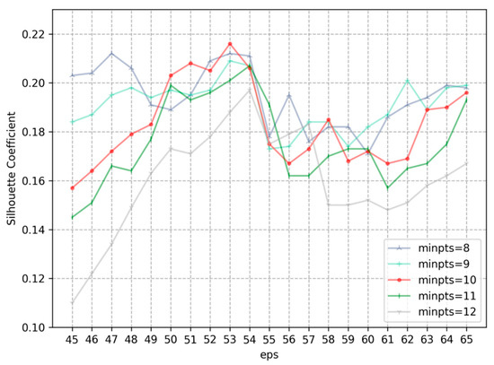 This algorithm has two parameters that decide the identity quality of the ULDs. We chose a typical sample region in the study area with multiple densities POIs and land types for testing the clustering effect to obtain suitable parameters. The silhouette coefficient [57] was used as an indicator for parameter selection. The silhouette coefficient is defined the intra-cluster and inter-cluster dissimilarity to evaluate the result. The larger the value, the more desirable the result. In this study, we used a multifunctional land area located in the Dongshan secondary city as the training area, and different parameter sets were applied in the clustering algorithm. The results (Figure 3) suggest that achieved the best performance for our study area.
