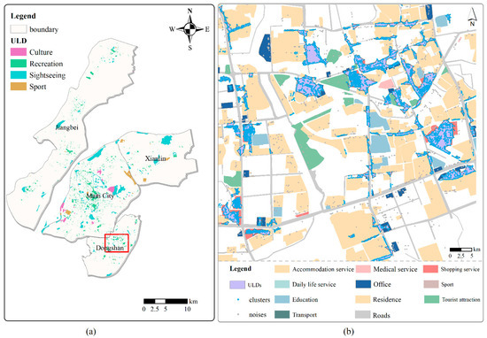 Recognition results of the ULDs in Nanjing (a) and the implementation details of the ULD recognition method in the selected sample region (b), which is the magnification of the red frame in (a). (b) shows the ULDs generated by leisure POI clusters, and the leisure area near the residence was successfully identified.