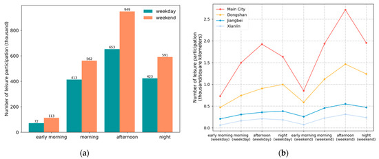 The spatial unevenness and temporal single-peak pattern of leisure activities are uncovered by counting the number of leisure activity participants during different weekdays and weekends. Leisure in the afternoon is the most popular among people, followed by in the evening. This differs from the results of García-Palomares, Juan Carlos et al.’s study of urban dynamics in Madrid based on Twitter data by García-Palomares, Juan Carlos et al. (2018) [59], who identified the morning and evening as peak hours for tourism and cultural activities, respectively.