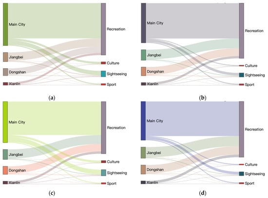 According to Figure 5b, the order of leisure activity intensities is the main city, Dongshan secondary city, Jiangbei secondary city, and Xianlin secondary city. On the one hand, leisure activity participation corresponds to the spatial heterogeneity in the construction of leisure facilities, and ULD densities (number of ULDs per km2) are 3.92, 2.27, 1.17, and 0.71, respectively. On the other hand, it is also closely related to urban functional planning. The main city is the core of Nanjing city, equipped with complete service resources and attracting a large population. The Dongshan district has many scientific and technological companies, automobile production and trade industries, and green waterfront open spaces such as the Qinhuai River and Niushou Mountain. Since 2014, Jiangbei has become the focus of Nanjing’s urban development strategy to build an ecologically low-carbon, livable, and sustainable urban area. Due to a relatively late start, the intensity of people’s leisure activities has not yet reached the level of the central and southern urban areas (Dongshan). In contrast, Xianlin is mainly positioned as an “Educational Technology Innovation Center”, and the daily activities of the abundant college students are carried out on the university campus.