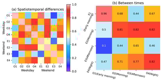 Firstly, as shown in Figure 7a, the similarity between different periods of the weekday (O2 to O4) is significantly higher than that of the weekend (E2 to E4), and the differences between the early morning hours and other periods are very prominent. Secondly, by comparing the same activity period on weekends and weekdays (Figure 7b), it can be found that the distribution of leisure activities in the afternoon has the largest difference (35%), and the leisure activities in the early morning have the most similarity (96%). Lastly, based on the cross-comparison of different periods, the activity patterns in the evenings of weekdays and weekends are closer to each other. The activity pattern in the morning on weekends is similar to that at other times of the weekdays. In particular, leisure activities in the early morning on weekdays and in the afternoon on weekends show a completely different picture.