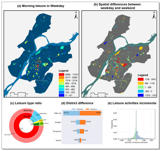 The most vibrant leisure area is mainly clustered in the center of the main city. Jiangbei is the second-ranked urban leisure district (Figure 8d). The overall leisure activity spatial distribution during the morning is relatively similar (81%). While sightseeing activities increased from 10.8% (weekday) to 11.13%, they are distributed in the main city and the Jiangbei district. The activity increment is mainly distributed in the range of 0~200 (Figure 8e), and the reduction is concentrated in the range of 0~100. The proportion of sports activities decreased, while cultural activities increased slightly (0.07%).