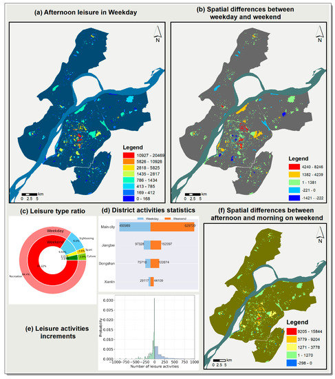 In the afternoon, the overall scale of leisure activities greatly increased as compared with the morning (according to Figure 8a and Figure 9a). The main city contributes the most (the number of leisure activities increased by more than 387 thousand), and Figure 9f shows these change characteristics. Sightseeing and cultural leisure became more popular as compared with weekdays. The activities increment value is mainly distributed in (−250, 0) and (0, 500). Most urban leisure venues ushered in more patrons during this period, as shown in Figure 9b.