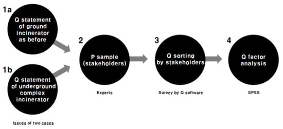 We employed the Q-methodology to estimate the perceptions of experts (academicians, industrialists, environmental ecologists, and engineers) on underground incinerators. This methodology can be used to analyze the subjectivity of individuals. It has the advantage of comparing different perceptions of stakeholders and identifying both majority and minority perceptions [14]. The Q methodology derives statements from a literature review and and interview as qualitative approaches, and then goes through the process of deriving quantitative results using a structured questionnaire called Q sorting. It has the advantage of being able to examine the research subject in depth qualitatively and objectify the results quantitatively [15]. In addition, Q-methodology is effective for studies with a small sample size, such as a group of experts, because it can quantitively analyze statements rather than people and thus can be conducted with only one person [16]. We also used Q-methodology to present alternatives by considering the minority and majority perceptions of experts regarding the construction of underground incinerators.