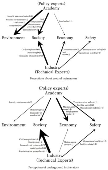 Regarding the common points recognized by the two factors, both emphasized economic (land value) and social (civil complaints) issues regarding ground incinerators and post-monitoring issues due to distrust in the safety of underground incinerators. Therefore, while recognizing such issues and considering local conditions, selecting the best alternative is necessary (Table 11). We confirmed that underground complex incinerators can cause distrust due to safety issues. A long-term [10] and strengthened post-monitoring process should be followed for easy community acceptance [12]. These results showed that the difference in perception between ground incinerators and underground complex incinerators concerned safety issues [27], and that monitoring should be strengthened to resolve the resultant distrust issue. Furthermore, both incinerators should be constructed based on accurate investigation, evaluation, and information sharing. Overall, we confirmed that safety and anxiety issues were associated more with underground complex incinerators than with ground incinerators; experts also indicated that it was necessary to objectively inform effect relationships via more accurate information about the aquatic environment, maintenance costs, and civil complaints.