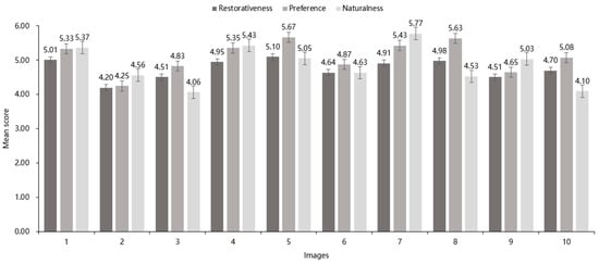 The aesthetic preference, restoration potential, and perceived naturalness of 10 images (n = 93); Mean ± error.