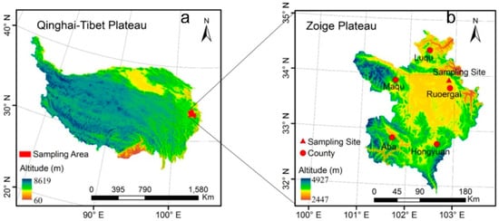 Maps of the study area showing the five main counties (red circles) and the sampling site (red triangle) on the Zoige Plateau (b) on the Qinghai–Tibet Plateau (a). Different colors represent different altitudes.