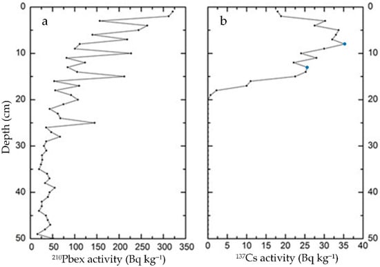 Unsupported 210Pb (a) and 137Cs (b) activities in the peat profile. The blue circles indicate two representative radioactive incidents: the peaks indicating nuclear tests at 13 cm in 1963 and the Chernobyl incident at 8 cm in 1986.
