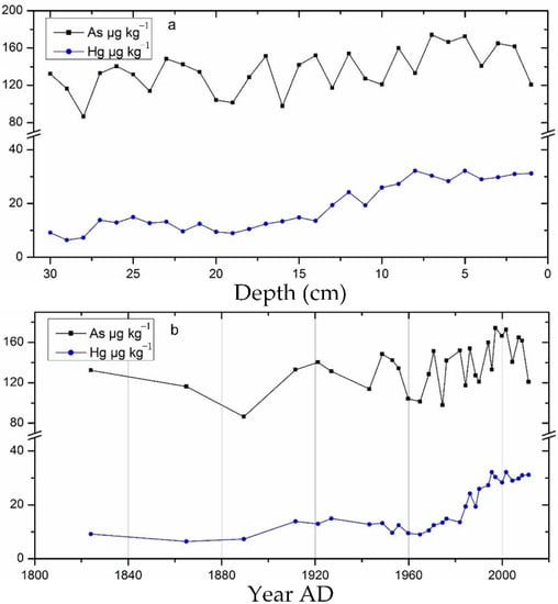 Variations in As (black lines) and Hg (blue lines) concentrations in the peat profile with depth (a) and dating (b).