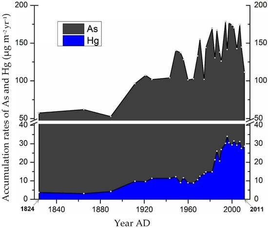 The largest increases of the accumulation rates of both As and Hg occurred during AD 1980–1990, leading to a maximum in AD 1990 of 146.97 and 22.30 μg m−2 yr−1, respectively (n = 5), almost twice to fivefold higher than those before AD 1900.