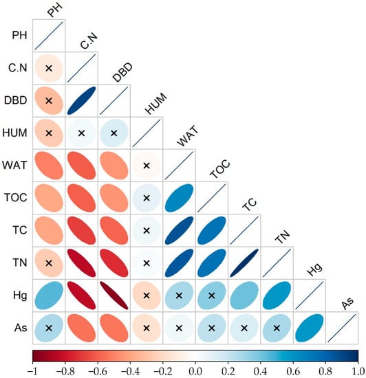 Correlation analysis between accumulation rates of As and Hg and other soil physicochemical properties, respectively. Blue and red indicate positive and negative correlations, respectively. The depths of the colors indicate correlation coefficients with either higher (darker) or lower (lighter) values. Shapes more elliptical or round represent lower or higher values of the significance level of p, respectively. The cross (×) represents the significance level p ≥ 0.05. PH, C.N, DBD, WAT, TOC, TC, TN, Hg, and As represent pH, the ratio of total carbon content to total nitrogen content, dry bulk density, mass water content, total organic carbon content, total carbon content, total nitrogen content, and accumulation rates of Hg and As, respectively.