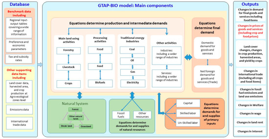 We used a more advanced version of GTAP, a well-known CGE model frequently used to examine trade, energy, or environmental issues [37], called GTAP-BIO. This latter model assess induced land use changes due to energy and trade policies [38,39,40]. Figure 1 summarizes its main components. The GTAP-BIO model represents the structure of the global economy and traces production, consumption, and trade of all types of goods and services (including, but not limited to, crops, livestock products, vegetable oils and meals, sugar, processed rice, and processed food items) at the global scale. It traces land uses (forestry, pastureland, cropland) and allocation of land across crops by country and agro-ecological zones (AEZ) at the global scale. The model reported by [40] allows for the possibility of multiple cropping and the potential to return idle land to crop production. It divides the world into six regions: the US, the EU, Brazil, other countries of South America (OCSA), China, and the rest of the world (other countries). The other countries in the South American region represents the main members of Mercosur (Argentina, Paraguay, Uruguay, and Venezuela) and the remaining countries in South America (Bolivia, Chile, Colombia, Ecuador, and Peru).