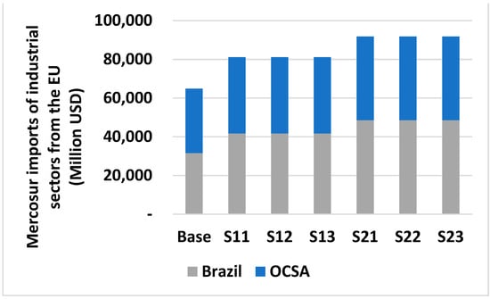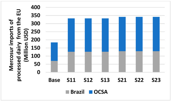 Finally, the reduction in Mercosur tariffs on processed dairy and other industrial sectors causes an increase in European exports to the Mercosur region, as shown in Figure 2 and Figure 3, respectively.