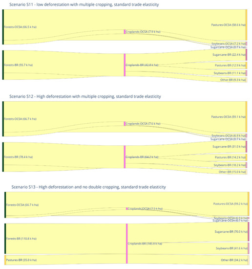 Figure 4. Land use change transitions for Brazil (BR) and other countries of South America (OCSA) under low trade elasticities scenarios (S11, S12, and S13).