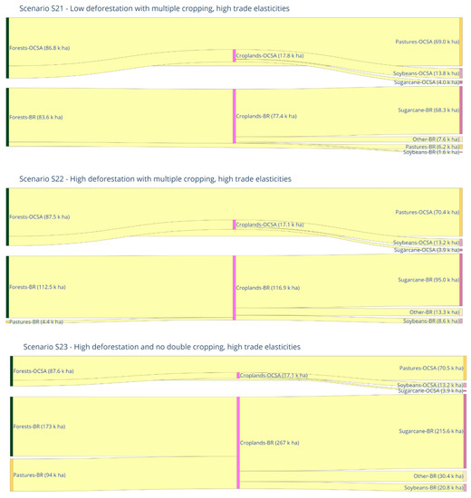 Figure 5. Land use change transitions for Brazil (BR) and other countries of South America (RSA) under high trade elasticities scenarios (S21, S22, and S23).