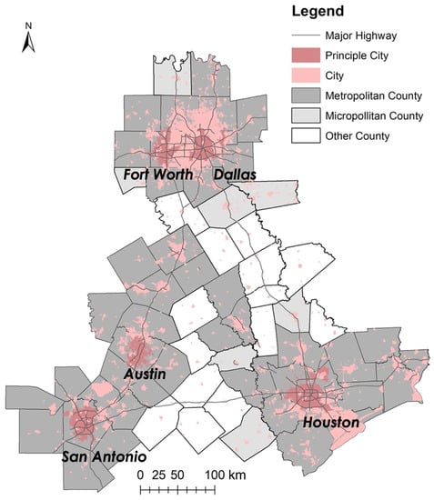 - Butler, K.; Hammerschmidt, S.; Steiner, F.; Zhang, M. Reinventing the Texas Triangle: Solutions for Growing Challenges; Center for Sustainable Development, School of Architecture, The University of Texas at Austin: Austin, TX, USA, 2009; p. 31. [Google Scholar]