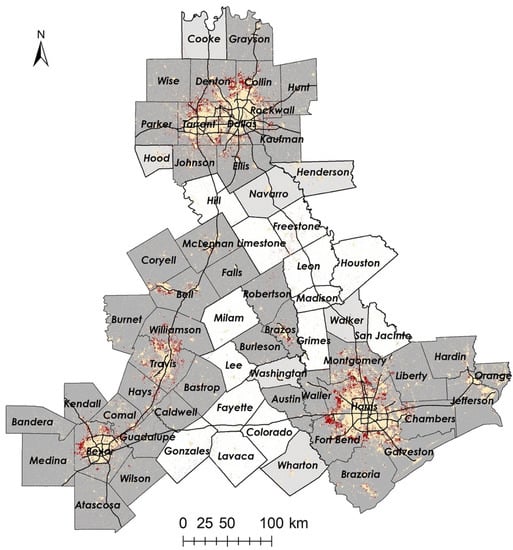 This study has several limitations, suggesting directions for future research. First, this study utilized data on land cover from satellite images, which provide very limited information on land uses for various urban functions. In future research, detailed land use information may be incorporated to allow analyses on variations of urban expansion by different functional types of land uses. Second, this study used imperviousness information from NLCD as a proxy for development intensity; the information provides a rather coarse measure that cannot adequately capture the variation of vertical urban expansion across cities and regions. Lidar data could be used to enhance this study with detailed urban form and vertical development characteristics [53,54]. Lastly, considering the vast area of the Texas Triangle, this study selected county as the geographic unit of analysis. The study findings and discussions are thus limited to the county level. There exist significant within-county variations that this study did not capture. Hence, the study can be refined with use of finer-scale data, for instance, at the census track or block group level.