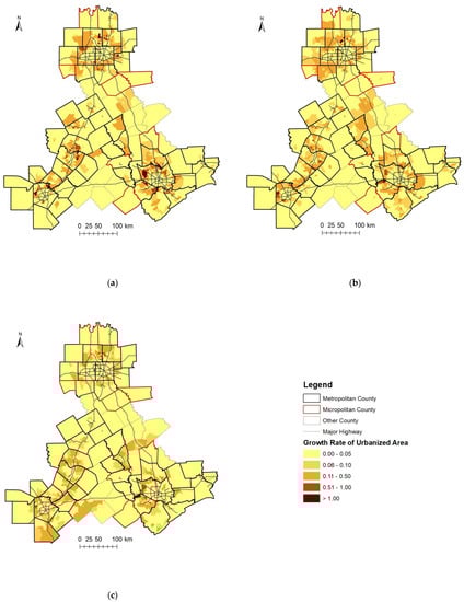 Maps of Urbanized Land Growth Rate in the Texas Triangle from 2001 to 2016: (a) 2001–2006; (b) 2006–2011; (c) 2011–2016.