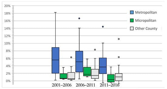 Figure 4 and Figure 5 show the spatial and temporal patterns of urban expansion in the Texas Triangle during the three time periods. The results, first, illustrate higher growth rates in metropolitan counties than other counties. From 2001 to 2016, the urbanized area has increased by 2887 km2, while 95% of those expansions occurred in metropolitan areas. Moreover, Figure 5 shows the decreasing growth rate over time in the Texas Triangle.