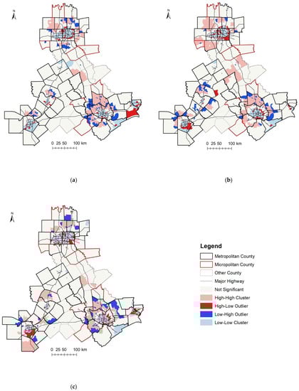 Between 2001 and 2016, metropolitan areas in the Texas Triangle displayed different patterns despite a shared experience of overall urban expansion. In particular, the Dallas-Houston corridor area showed clustered growth in the periods of 2001–2006 and 2006–2011. This clustered growth pattern, however, did not occur in 2011–2016. The San Antonio-Austin corridor presented clustered expansion throughout the study period of 2001–2016. The two metropolitan areas have now become contiguous, prompting Texas DOT to coordinate joint planning efforts by their respective metropolitan planning organizations [46]. The finding accords with previous studies by demonstrating the heterogeneous expansion patterns at the periphery of large cities [47]. Amid shifting expansion patterns in the areas between large cities and metro areas, state or joint state efforts are necessary to foster cooperation beyond the municipal or agency’s jurisdictional boundaries.