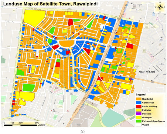 The built-up area of Lahore has doubled in size in just over a decade (1999–2011) [41]. In 2013, the population of the city was 17.11 million, with 82% living in urban areas and the rest residing in peri-urban areas. Lahore covers an area of 1790 square kilometers [42,43]. Rawalpindi is the fourth largest city in Pakistan and is also located in Punjab. It is an industrial, military, and commercial hub [44]. The city has experienced rapid urbanization and land transformation as a result of natural processes, migration and governance. Rawalpindi covers an area of 5286 square kilometers. Traditional neighborhoods in the city are characterized by short, narrow and unnamed streets in residential areas [40]. Figure 1 and Figure 2 show selected neighborhoods in Lahore and Rawalpindi. In Pakistani cities, minibuses, wagons, small pick-up vans, and Chingqis (motorcycles) are used as public transport modes in the fixed routes. In Rawalpindi, Metro Bus Service runs through different neighborhoods. The Lahore Metrobus is a bus rapid transit service running in Lahore and crossing Lahore district with connection to suburban areas.