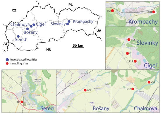 Bošany landfill (BO1, GPS 48°35′24.8″ N; 18°16′16.6″ E). The investigated area of the reclaimed landfill, fed by the Babica tannery in Bošany, is located in the Horná Nitra region. It represents the area of the 3rd environmental quality, which is a region with a severely disturbed environment. The landfill was established in 1970 in the dead arm of the River Nitra resulting from some water management modifications. The waste, coming from leather and shoe production, was deposited directly into the water [37]. Waste disposal was completed in 1992. Currently, the landfill is spread over concrete panels on an area of approximately 2800 m2. The area around the landfill is used for agriculture. From the geomorphological point of view, the wider surroundings of the investigated locality belong to the central part of the Nitra loess hill [38]. The area belongs to the climatic area and is warm and dry with a mild winter. The average annual temperature is 9.6 °C, and the average annual precipitation is 600 mm. There are Eutric Fluvisols and Eutric Cambisols, which are moderately difficult.
