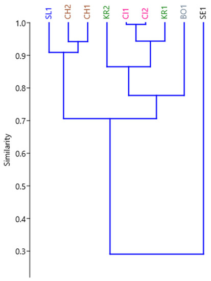 The dendrogram of the hierarchical cluster analysis of environmental parameters at the investigated localities of problem areas in Slovakia is shown in Figure 2. HCA is identified in accordance with the monitored environmental parameters in relation to the area and common source of pollution by three groups of risk elements: Group I includes CH1–CH2 and SL1, and this group includes problem areas located in the emission field of landfills originating from power plant fly ash and waste from copper metallurgy and after the treatment of iron ores. In these localities, above-limit content was found, especially of Co and Cd. Group II consists of CL1–CL2 together with KR1, KR2 and BO1, and this group consists of areas in the emission field of coal sludge, iron ore slag and copper metallurgical waste and waste from leather and shoe production, where the limit values, in particular Cd, have been exceeded. Group III is formed by SE1 and includes the surroundings of the area of the former nickel smelter where the lusher landfill is located. The investigated area is contaminated mainly by Ni and Cr.