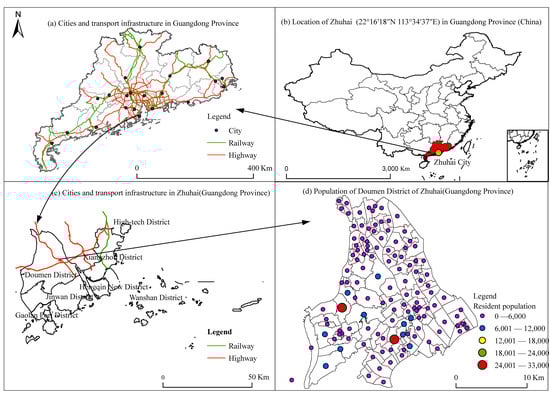 The geographic distribution of the study area. (a) Cities and transport infrastructure in Guangdong Province. (b) Location of Zhuhai in Guangdong Province (China). (c) Cities and transport infrastructure in Zhuhai (Guangdong Province). (d) Population of Doumen District of Zhuhai (Guangdong Province).