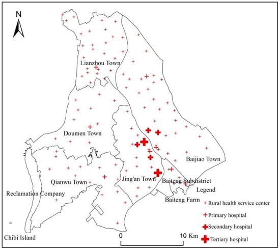 Spatial layout of multilevel medical facilities in Doumen District of Zhuhai (Guangdong Province). China, 2020.