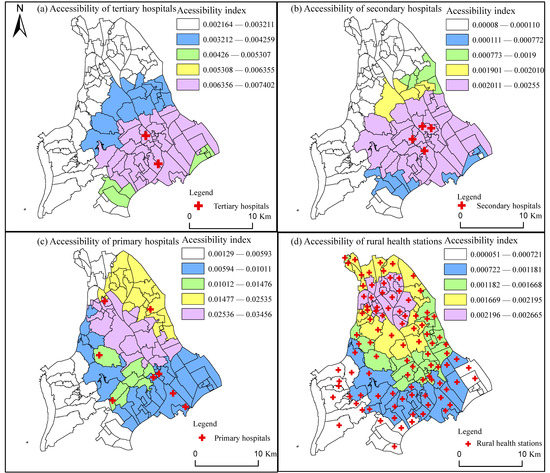 (1) The spatial differences in the accessibility between the levels of public health facilities in Doumen District were relatively significant: the higher the level of health facilities, the greater the spatial differences in their accessibility. In terms of the spatial accessibility of tertiary hospitals, the accessibility of the southeastern part of Doumen District was relatively high, while the accessibility of the western and northern parts was relatively low. In terms of spatial accessibility of secondary hospitals, the accessibility of the southeastern and central parts of Doumen District was relatively high, while the accessibility of the western and northern parts was relatively low. The spatial accessibility layout of secondary and primary hospitals was somewhat similar. From the viewpoint of the spatial accessibility of primary hospitals, the accessibility was higher in the central and northern parts of Doumen District, and lower in the western and southern parts. The northern part of Doumen District had the highest accessibility to rural health stations, and its accessibility was spatially distributed in a circular pattern from north to south. There are some similarities and differences between the findings of the current study and previous studies. The similarity lies in the relatively high accessibility of high-level and large-scale health service facilities. The difference lies in the suggestion by relevant studies of public health facilities that the level of health facilities is negatively correlated with the spatial difference of their accessibility, i.e., the higher the level of health facilities, the smaller the spatial difference of their accessibility; however, this study suggests that the level of health facilities is positively correlated with the spatial difference of their accessibility, i.e., the higher the level of health facilities, the greater the spatial difference of their accessibility [47,48,49].
